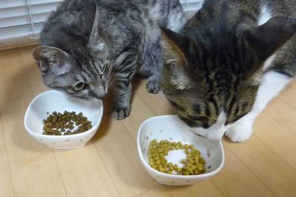 さて、トップの写真のエサの色に注目。ヒス子は消化吸収が良く身につきやすい「ロイヤルカナンの消化器サポート」、ボスとヒッキーは肥満・便秘気味なので「ヒルズのr/d」が処方食として出されてます。ヒス子のはいかにも栄養豊富、そしてボスのはカスカスって感じの色をしてます。(^^;;