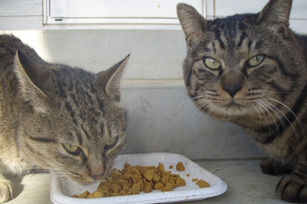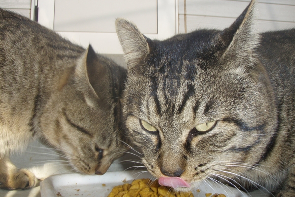 “あずき”は最初どこかにスポンサーがいるのか、丸々と太っていて、よもぎと同じくらいの体に不釣り合いな程大きな顔をしていた。…ところが、いつ頃か喧嘩で負けてボスの座を明け渡したのか(?想像)それから痩せていき、空腹で身内のよもぎを慕って我が家に来ることが多くなった。