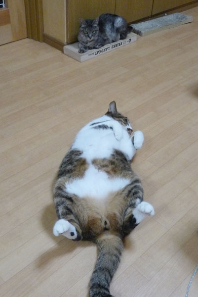 ボスは7.15kg。ヒッキーは4.8kg。一時はウエットフードにグルコマンナンを加えて、全体的な量を減らしつつ、水分を多くとって便を出やすくする作戦で減量出来ていたけど、ボスがウエットフードを食べなくなった+ヒス子の下痢が始まったので、今ではすっかりドライフードだけになってます。…とは言え、最近は肥満対策用の「r/d」だけしか与えてないんだけど…ねぇ…。