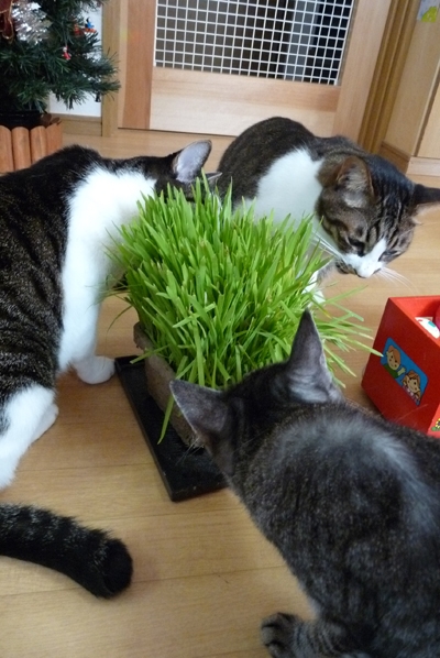 ホームセンターで買ってきた猫草は丈も低く、柔らかい葉っぱなので、猫達いっぱい食べてます。